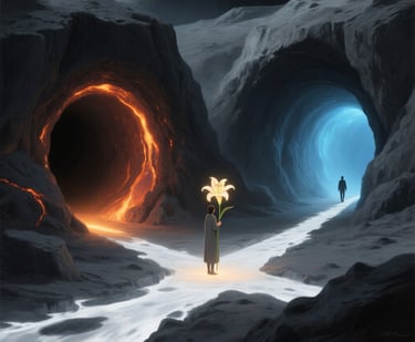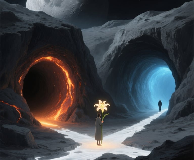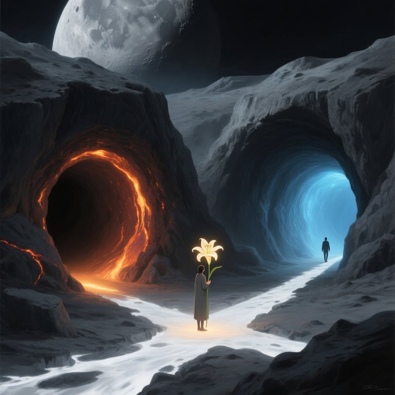 We were inside a cave, reminiscent of the lunar lava tubes from our project. As we walked through the darkness, I found myself holding a white lilium flower in my palm. It glowed with a pure, radiant energy, lighting my path through the cave. When we reached a crossroads with two separate tubes, we parted ways without a second thought. I was so completely mesmerized by the flower and my mission to find the power distribution unit. I didn't care at all about the separation.